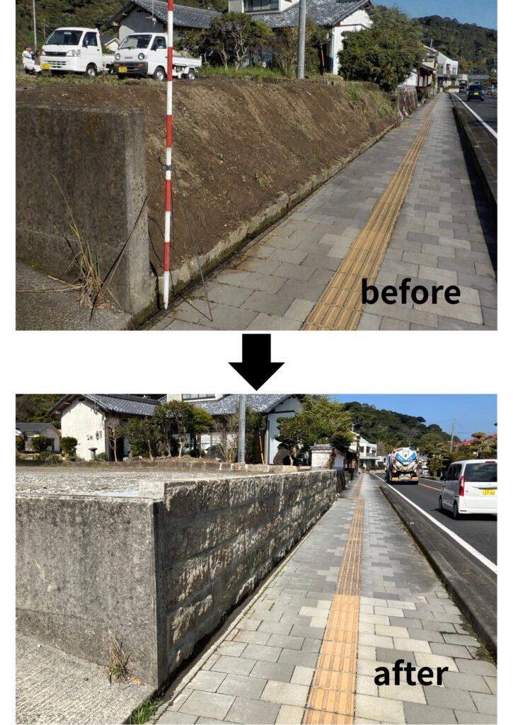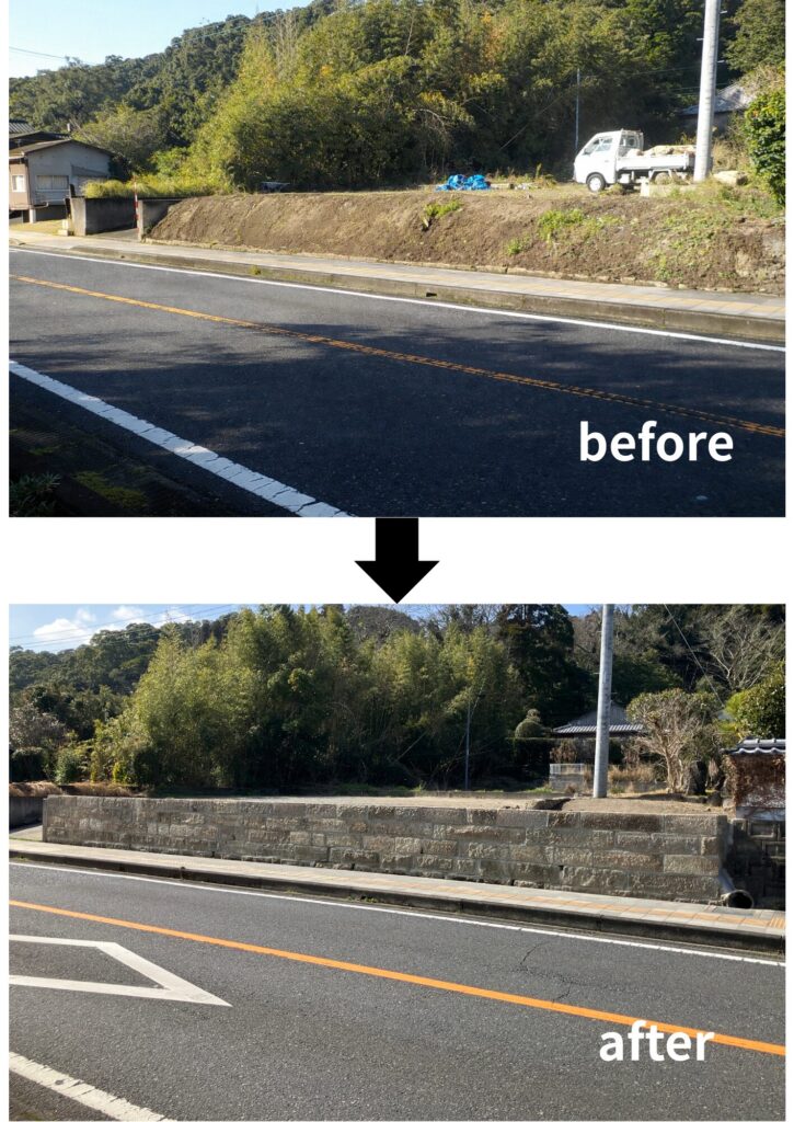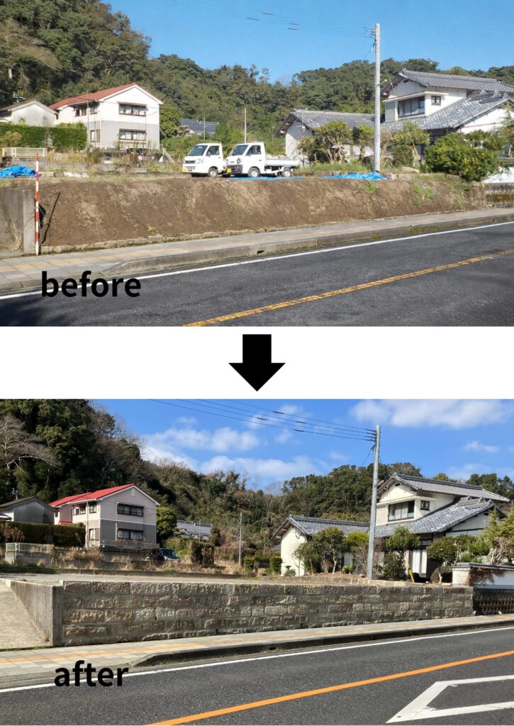 ・経 緯:令和6年度台風10号の暴風雨により、石垣及び石垣の上に 構築されていたコンクリートブロック塀が倒壊したため ・改修内容:修理工事(下部2段) 石垣の解体修理(伝統的建造物(工作物)No.110) 修景工事(上部3段) 石垣の部分修景(伝統的建造物(工作物)No.110の石垣の上に石垣を増築) その他 S様邸 石垣(修理・修景)工事 伝統的建造物郡保存地区 工期 令和7年10月24日~ 令和8年2月13日
