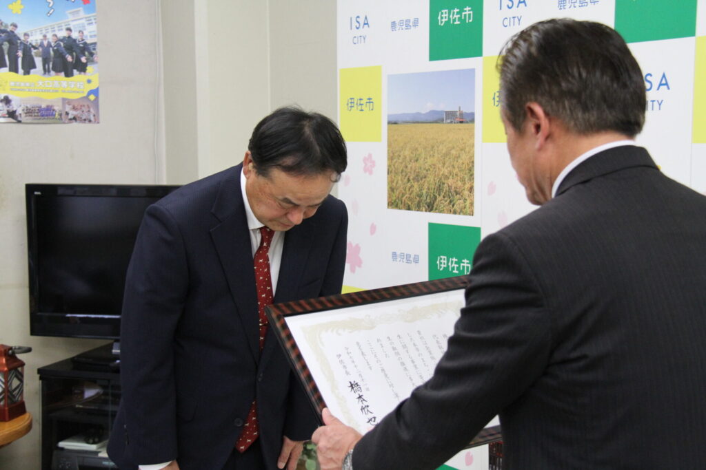 昨年に引き続き、企業版ふるさと納税を活用した伊佐市のまち・ひと・しごと創生に関する事業に寄付をし、12月11日に伊佐市長 橋本欣也様より感謝状をいただきました。